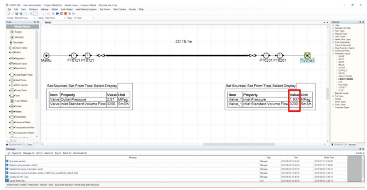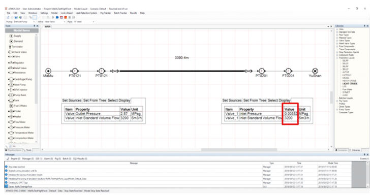 為了進一步驗證輸油管道當(dāng)前的運行狀態(tài),使用模擬仿真系統(tǒng)建立了原油管道的模型(圖 9)并進行相關(guān)的分析,根據(jù)當(dāng)前輸油管道的工況,設(shè)定輸量為 3200 m³/h,馬目首站出站壓力為2.57 MPa,如果是正常原油滿管輸送操作模式下,計算出魚山末站進站壓力應(yīng)該保持在1.97 MPa。