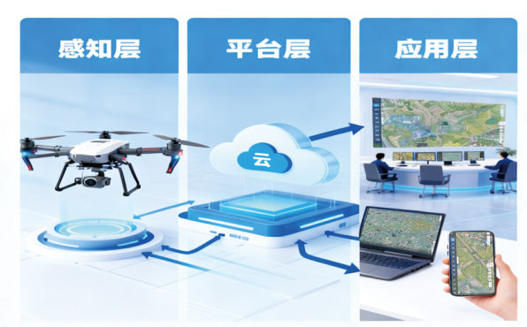 遵循數(shù)據(jù)驅(qū)動(dòng)、可視指揮與高效協(xié)同的核心原則,構(gòu)建以無人機(jī)系統(tǒng)為主的感知層,以地理信息平臺(tái)為智慧中樞與協(xié)同樞紐的平臺(tái)層,以手機(jī)、平板電腦等終端為信息顯示與指令發(fā)布的應(yīng)用層,系統(tǒng)性重塑從態(tài)勢(shì)感知到指揮決策,再到現(xiàn)場(chǎng)執(zhí)行的全流程作業(yè)體系。