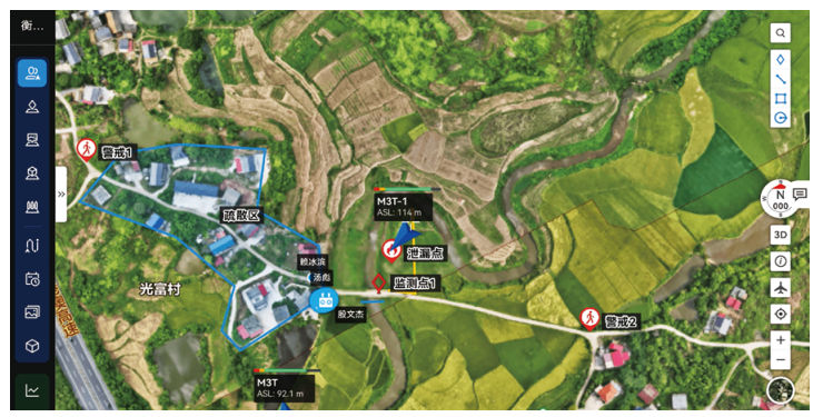 智能巡飛體系是應(yīng)急現(xiàn)場(chǎng)信息獲取能力的關(guān)鍵補(bǔ)充。依托地理信息平臺(tái),指揮中心或操作員可預(yù)先規(guī)劃多架無人機(jī)的自動(dòng)化巡飛航線,并設(shè)定關(guān)鍵位置的懸停點(diǎn)與鏡頭參數(shù)。如分別部署航線持續(xù)監(jiān)控泄漏核心區(qū)、追蹤河流污染帶擴(kuò)散態(tài)勢(shì)、巡查主要救援通道保障通行安全等(圖 4)。