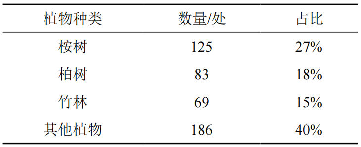 在植物種類分布方面(表 1),桉樹占比最高(27%),其次為柏樹(18%)和竹林(15%)。高后果區(qū)占壓點(diǎn)多集中于城鎮(zhèn)邊緣(如德陽市旌陽區(qū)),與地方政府綠化政策直接相關(guān)。
