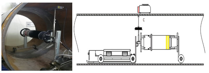 (2)DR檢測技術分類。“中心透照”是射線源在管道內曝光,數(shù)字探測器在管道外部對焊道進行數(shù)字成像的檢測技術,主要由牽引車、高頻X射線源(周向)、磁介定位系統(tǒng)、管壁爬行器、數(shù)字探測器、運動控制系統(tǒng)和數(shù)字成像系統(tǒng)組成(圖 1)。“雙壁單影透照”是射線源與探測器均在管道外部對焊道進行數(shù)字成像的檢測技術,主要由管壁爬行器(射線源車)、高頻X射線源(定向)、管壁爬行器(探測器車)、數(shù)字探測器、運動控制系統(tǒng)和數(shù)字成像系統(tǒng)組成(圖 2)。