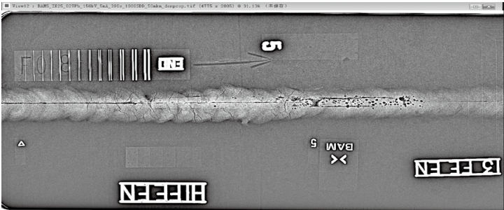 (1)DR檢測原理。X射線透過金屬材料后,其強度會由于材料的吸收現(xiàn)象而發(fā)生改變,而這些記錄著吸收量信息的射線會被射線探測器接受,并經過模擬數(shù)字信號的轉變而被計算機所接受,形成數(shù)字圖像,并按照一定格式儲存在計算機內,可在顯示器上顯示。專業(yè)人員可根據(jù)這些圖像進行缺陷評定。