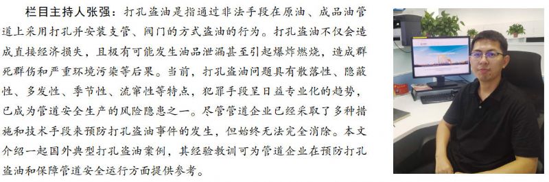 (2)加快技防措施的實施與應用。針對目前防范打孔盜油很難實現(xiàn)24小時監(jiān)控的現(xiàn)狀,在管道重點道口、敏感區(qū)域安裝固定式視頻監(jiān)控設備,并與地方公安聯(lián)網(wǎng),通過技術(shù)手段及早發(fā)現(xiàn)打孔盜油跡象或者及時消除打孔盜油隱患。利用一切有利條件,對易發(fā)打孔盜油的重點管段開展防腐層檢漏工作,查找預埋盜油點,條件允許的情況下,還可通過發(fā)送專項檢測器,排查是否還存在預留打孔盜油閥門或支管。