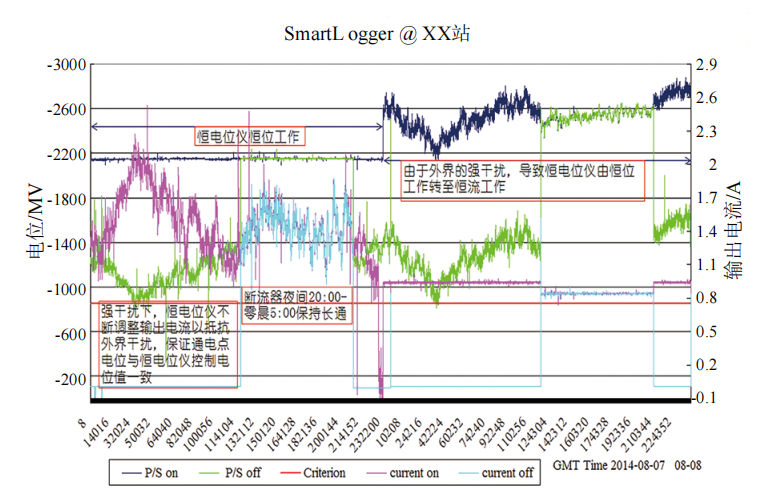 在直流雜散的檢測(cè)過(guò)程中,用CP-Thinker記錄儀記錄恒電位儀的輸出電流和通電點(diǎn)電位。