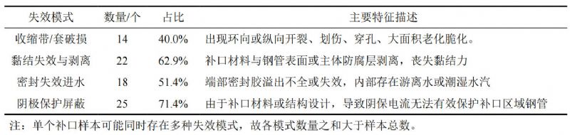 數(shù)據(jù)顯示,陰極保護(hù)屏蔽現(xiàn)象最為普遍(71.4%),表明即便補(bǔ)口外觀完好,其結(jié)構(gòu)也可能使管體處于陰極保護(hù)的“盲區(qū)”。黏結(jié)失效(62.9%)與密封失效(51.4%)是導(dǎo)致腐蝕介質(zhì)侵入的直接原因,構(gòu)成了補(bǔ)口失效的核心要素