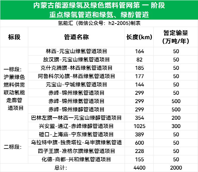 內(nèi)蒙古能源綠氫及綠色燃料管網(wǎng)項目。2025年3月14日,中化商務電子招投標平臺發(fā)布《內(nèi)蒙古能源綠氫及綠色燃料管網(wǎng)第一階段重點工程前期工作及可行性研究項目招標公告》,招標人為內(nèi)蒙古能源集團子公司內(nèi)蒙古蒙氫管網(wǎng)有限公司。本次招標總長度達4400Km,共計14條管線,包括10條綠氫管道、3條綠醇管道、1條綠氨管道。其中最長的為興安盟-通遼-赤峰綠醇管道項目,長度約1025km;最短的為敖漢旗-元寶山綠氫管道項目,長度約82km。本次招標項目共劃分為2個標段。一標段為滬蒙綠色燃料供需聯(lián)動氫能走廊管道項目;二標段包括:磴口-上海廟-寧東輸氫管道項目、烏拉特中旗-獨貴塔拉-烏審旗輸氫管道項目、四子王旗至準格爾旗輸氫管道項目和化德-商都-興和輸氫管道項目。