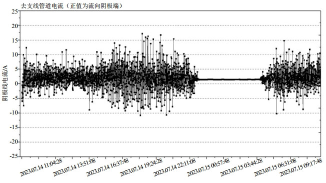 當(dāng)集石支線與干線管道跨接時(shí),地鐵干擾電流會(huì)在干線管道和支線管道之間相互流動(dòng),導(dǎo)致支線管道可能會(huì)受到干線雜散電流的干擾。由圖 3可以看出,當(dāng)干線與集石支線斷開跨接時(shí),跨海絕緣接頭處的跨接電流明顯減小,當(dāng)干線與集石支線跨接時(shí),有較多的干擾電流通過恒電位儀陰極端的跨接處流入流出至管道其他段。因此采用分段絕緣措施通過阻隔干擾電流的流通路徑來減弱雜散電流的干擾影響。