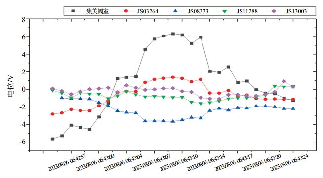 斷開集美閥室干線與支線的跨接,且將恒電位儀調(diào)節(jié)成僅保護(hù)支線管道狀態(tài),恒電位儀輸出保持為恒流3 A。對(duì)支線沿線管道進(jìn)行24 h通斷電電位測(cè)試,結(jié)果如表 3和圖 4所示。可見集美閥室位置干擾最大,通電電位波動(dòng)范圍為﹣8.922 V~6.346 V,斷電電位波動(dòng)范圍為﹣1.235 V~0.584 V。集美閥室、JS01042、JS11288、JS12001和JS13003共5處位置依然不滿足AS 2832.1―2015準(zhǔn)則相關(guān)要求,其余7處位置保護(hù)效果良好。與斷開前的檢測(cè)結(jié)果相比,支線的整體干擾幅度有一定程度的降低,但是在兩端靠近絕緣接頭位置出現(xiàn)了干擾峰值點(diǎn)。均勻選取5處測(cè)試樁進(jìn)行時(shí)間對(duì)齊,根據(jù)電位偏移結(jié)果可以看出,集美閥室和測(cè)試樁JS08373位置為主要雜散電流流入流出點(diǎn),如圖 5~圖 7所示。