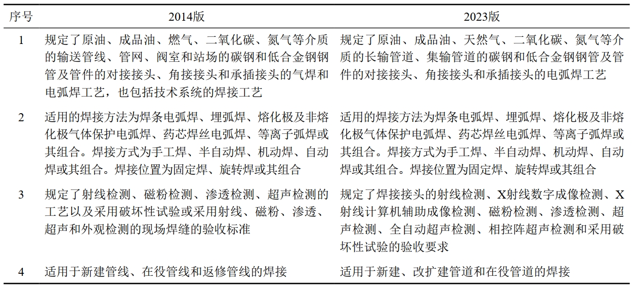 相對于2014版,2023版適用的管道介質(zhì)范圍有所縮小,輸送介質(zhì)將原“燃?xì)狻毙薷臑椤疤烊粴狻保懦藲錃獾绕渌細(xì)狻z測方法增加了X射線數(shù)字成像檢測、X射線計算機輔助成像檢測、全自動超聲檢測、相控陣超聲檢測等數(shù)字化無損檢測方法,適應(yīng)當(dāng)前油氣管道建設(shè)數(shù)字化交付的需求。適用的管道類型為長輸管道和集輸管道,刪除了閥室和站場的工藝管道。增加了改擴建管道,刪除了返修管線。在附錄B中針對在役管道焊接給出了清晰的界限,即含有輸送介質(zhì)的帶壓或不帶壓、流動或不流動的管道系統(tǒng),在該管道系統(tǒng)中與外管壁直接接觸、熔合的焊接操作。