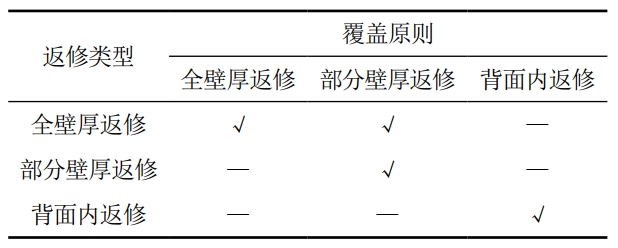2023版規(guī)定了二次返修需單獨進(jìn)行焊接工藝評定,還規(guī)定了全壁厚返修、部分壁厚返修和背面內(nèi)返修三種返修類型,以及不同返修類型的覆蓋規(guī)則,如表 5所示。