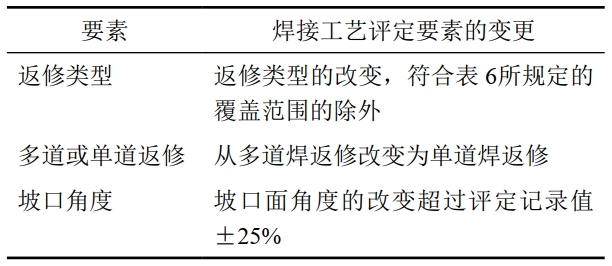 返修焊的焊接工藝評定基本要素,除符合手工焊和半自動焊的基本要素,還應(yīng)符合表 6的規(guī)定。評定合格的對接焊縫返修工藝,適用于支管焊縫和角焊縫的返修焊接。二次返修評定合格的返修工藝,適用于一次返修焊接。