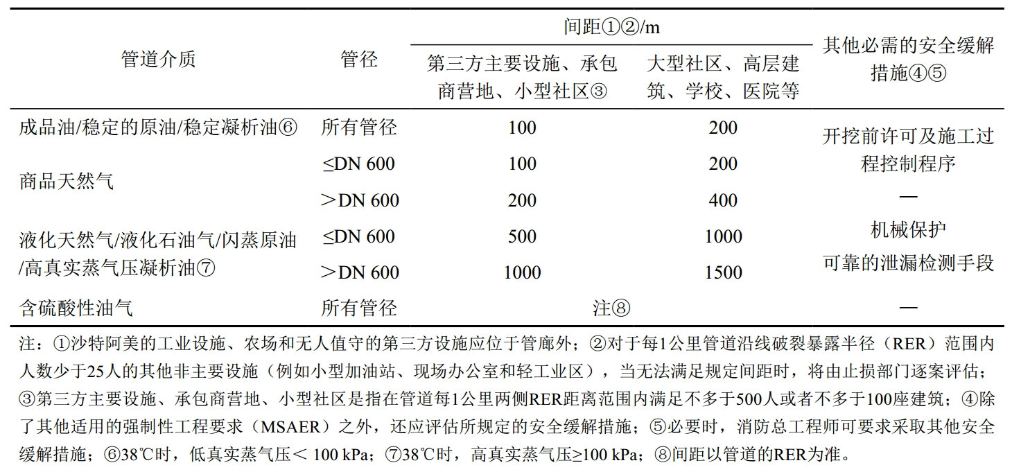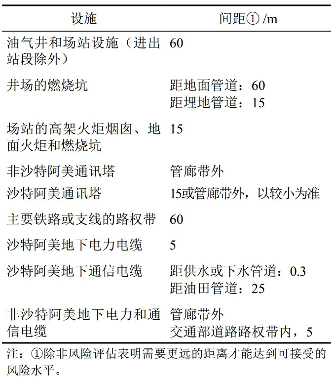 管道及電力線、通信線作為線性工程有共同的特點(diǎn),在野外多沿公路敷設(shè),在城郊鋪設(shè)在經(jīng)過規(guī)劃的廊帶。新建油氣管道多數(shù)會(huì)并行或交叉穿越這些服務(wù)設(shè)施,因此與這些設(shè)施的間距要求也是各類規(guī)范的關(guān)注重點(diǎn)。沙特阿美SAES-B-064作為管道設(shè)計(jì)及施工的安全專篇規(guī)范,匯總規(guī)定了關(guān)于油氣管道與不同設(shè)施的間距要求,有利于設(shè)計(jì)及施工技術(shù)人員集中參考。