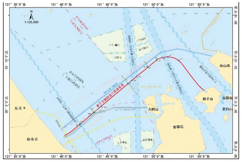 (2)實(shí)體航標(biāo)與AIS虛擬航標(biāo)布設(shè)。根據(jù)海域管理情況,在開(kāi)闊海域的杭州灣海底管道設(shè)置5個(gè)實(shí)體航標(biāo)標(biāo)示管道路由(圖 2),使過(guò)往船舶清晰可見(jiàn)。但在通航水域環(huán)境復(fù)雜、設(shè)施繁多的冊(cè)鎮(zhèn)海底管道,建設(shè)實(shí)體航標(biāo)項(xiàng)目推進(jìn)和審批難度極大,故設(shè)置2個(gè)虛擬AIS電子航標(biāo)。AIS虛擬航標(biāo)不在水中設(shè)置構(gòu)筑物,不會(huì)影響正常通航,通過(guò)無(wú)線電傳播信號(hào),其航標(biāo)效能發(fā)揮穩(wěn)定,不受天氣、海況的影響和限制,有助于過(guò)往船舶通過(guò)雷達(dá)、電子海圖、船載AIS設(shè)備等途徑判斷與管道相對(duì)位置,為采取避險(xiǎn)措施提供較準(zhǔn)確的位置信息。與傳統(tǒng)航標(biāo)相比,其建設(shè)和維護(hù)成本可節(jié)省約三分之二,還可根據(jù)實(shí)際需要調(diào)整其發(fā)射設(shè)備參數(shù)、數(shù)量、位置和進(jìn)行維護(hù),也無(wú)需像傳統(tǒng)航標(biāo)需固定周期開(kāi)展海上巡檢工作。
